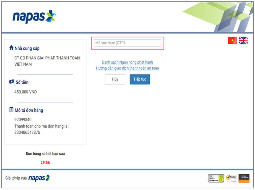 *Lưu ý: Giao dịch sẽ hết hạn sau 15 phút