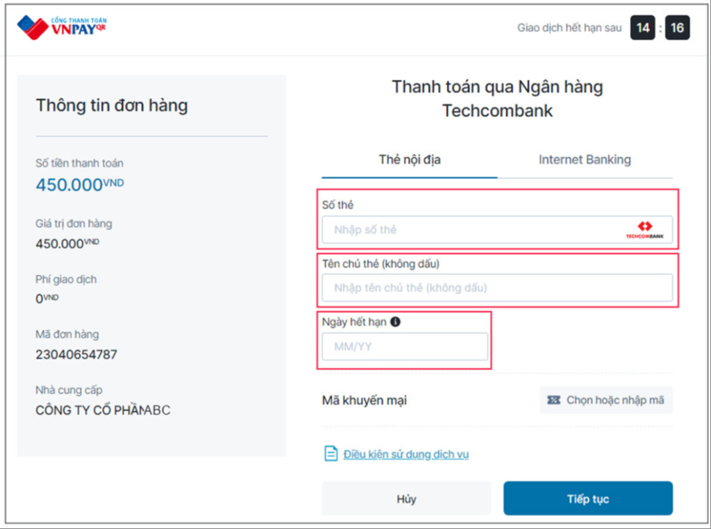 Giao diện thanh toán qua “Thẻ nội địa và tài khoản ngân hàng”