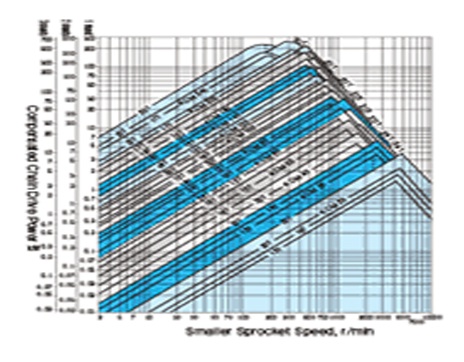 Biểu đồ lựa chọn nhanh : xích con lăn nên được chọn từ một bảng lựa chọn đơn giản dựa trên số vòng quay của đĩa xích nhỏ (r/min) và khả năng truyền động cần thiết (kW đã hiệu chỉnh).